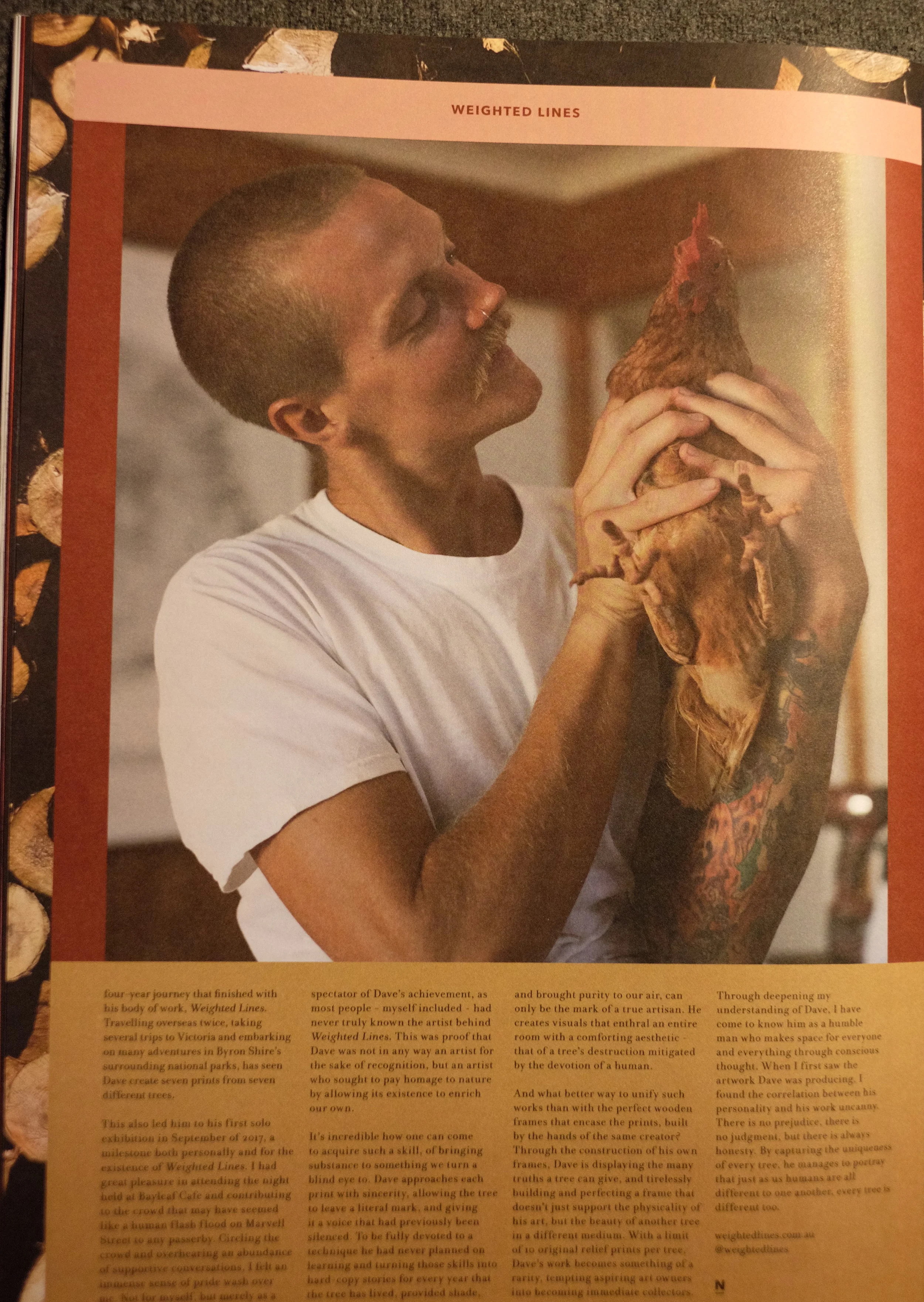 Dave expressed the visceral experience he has come to know by spending time out in quietness amongst the tall giants and that seeing first light weave through and fall on new breadths, revealing nature’s contours is an antidote to all worriment. This was an integral part of what facilitated the since 4 year journey of Weighted Lines. Travelling overseas twice, taking several trips to Victoria and embarking on many adventures in surrounding national parks of the Byron Shire has seen Dave to showcase 7 prints from 7 different trees and tell their stories. This lead him to host his first solo exhibition in September 2017, reaching a new milestone for both his personal life and the life of Weighted Lines. I had great pleasure in attending the night held at Bayleaf Cafe and contributing to the crowd that may have seemed like a human flash flood on Marvell Street to any passerby.